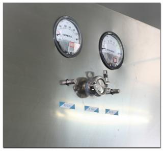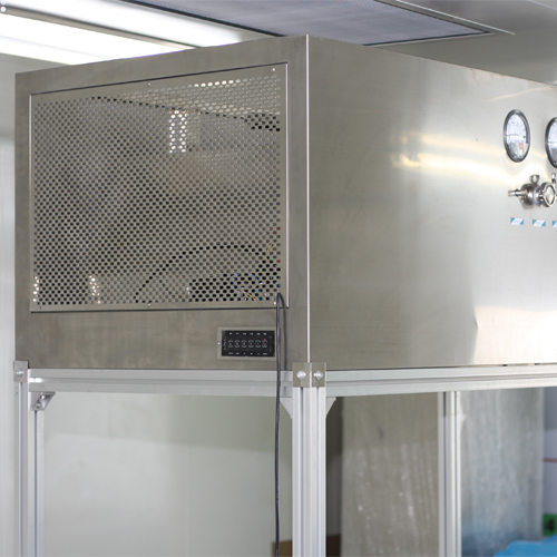 整體采用SUS304不銹鋼材料制作,利用大功率風機或中央空調系統(tǒng)進行送回風,溫濕度控制較為方便。過濾器采用液槽密封形式,確保無泄漏。層流罩氣流為垂直單向流,出風面可加裝均流膜,風速在0.36-0.55m/s,可通過煙霧測試證明單向流狀態(tài)。層流罩上安裝PAO發(fā)塵口,PAO上游采樣口,可對每臺過濾器進行現(xiàn)場檢測。層流罩隔離裝置采用防靜電PC板或防靜電軟簾。