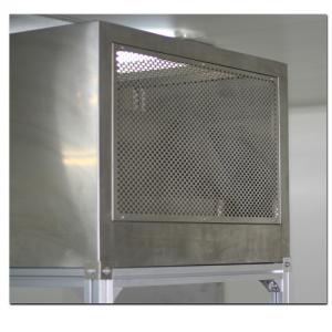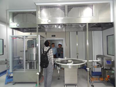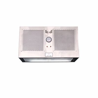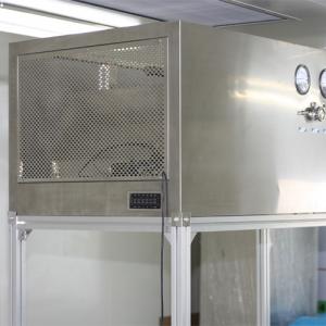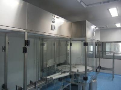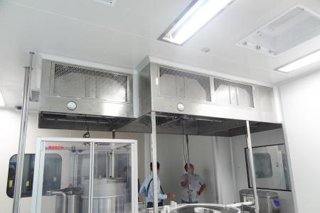 整體采用SUS304不銹鋼材料制作,利用大功率風機或中央空調系統(tǒng)進行送回風,溫濕度控制較為方便。過濾器采用液槽密封形式,確保無泄漏。層流罩氣流為垂直單向流,出風面可加裝均流膜,風速在0.36-0.55m/s,可通過煙霧測試證明單向流狀態(tài)。層流罩上安裝PAO發(fā)塵口,PAO上游采樣口,可對每臺過濾器進行現(xiàn)場檢測。層流罩隔離裝置采用防靜電PC板或防靜電軟簾。