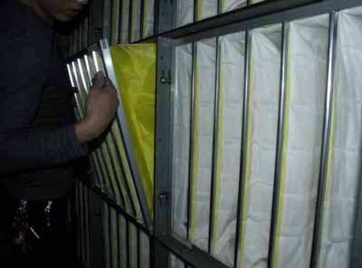 工人正在安裝更換新的F8級(jí)中效袋式過(guò)濾器